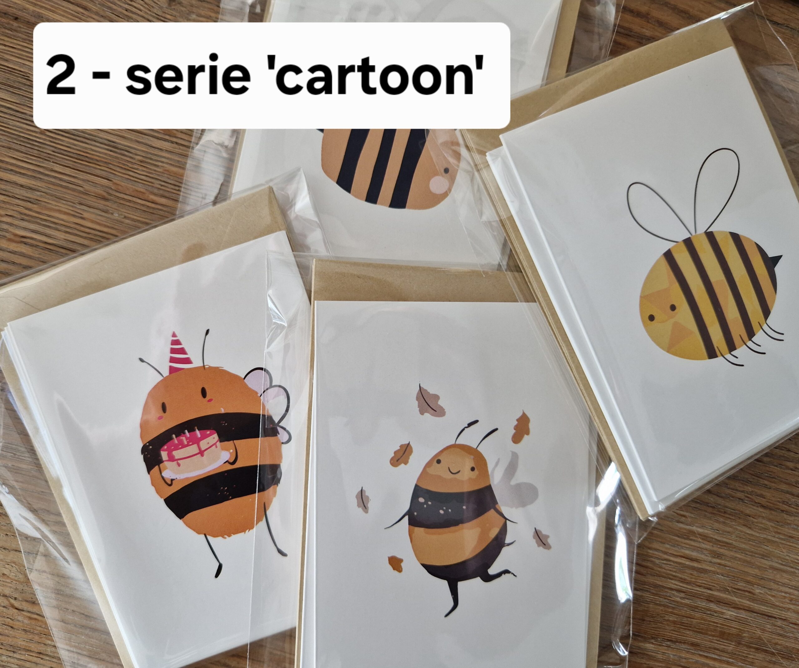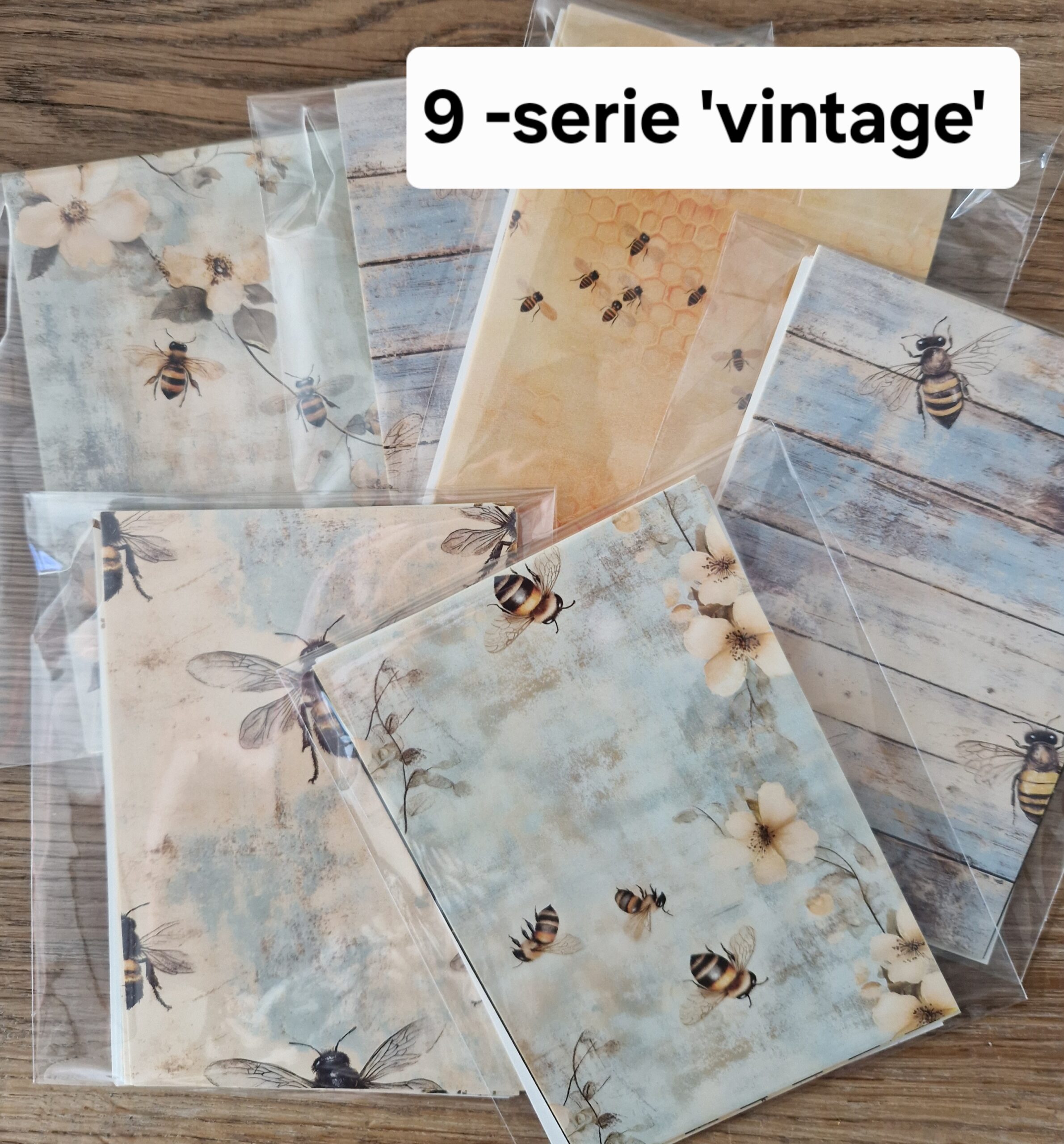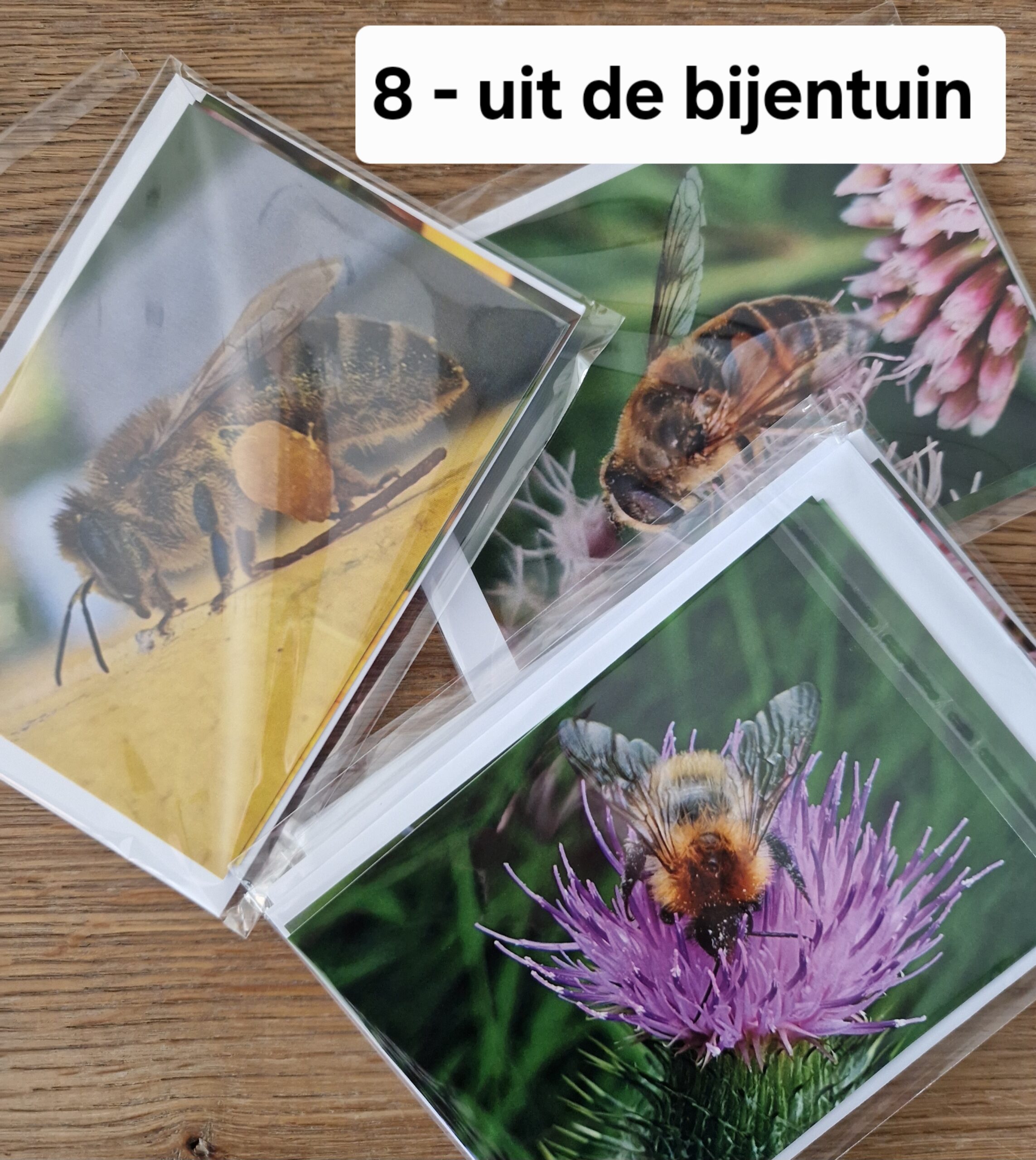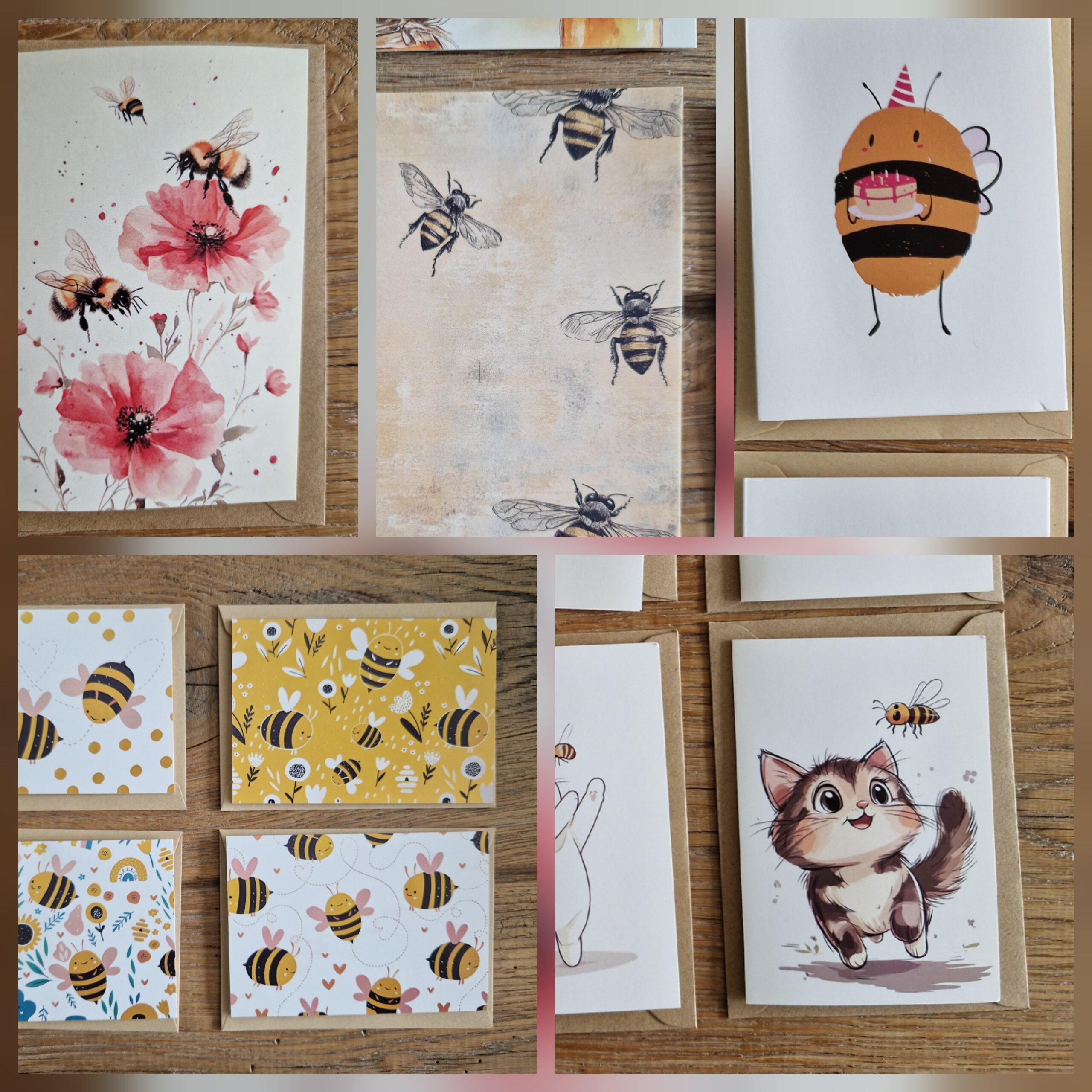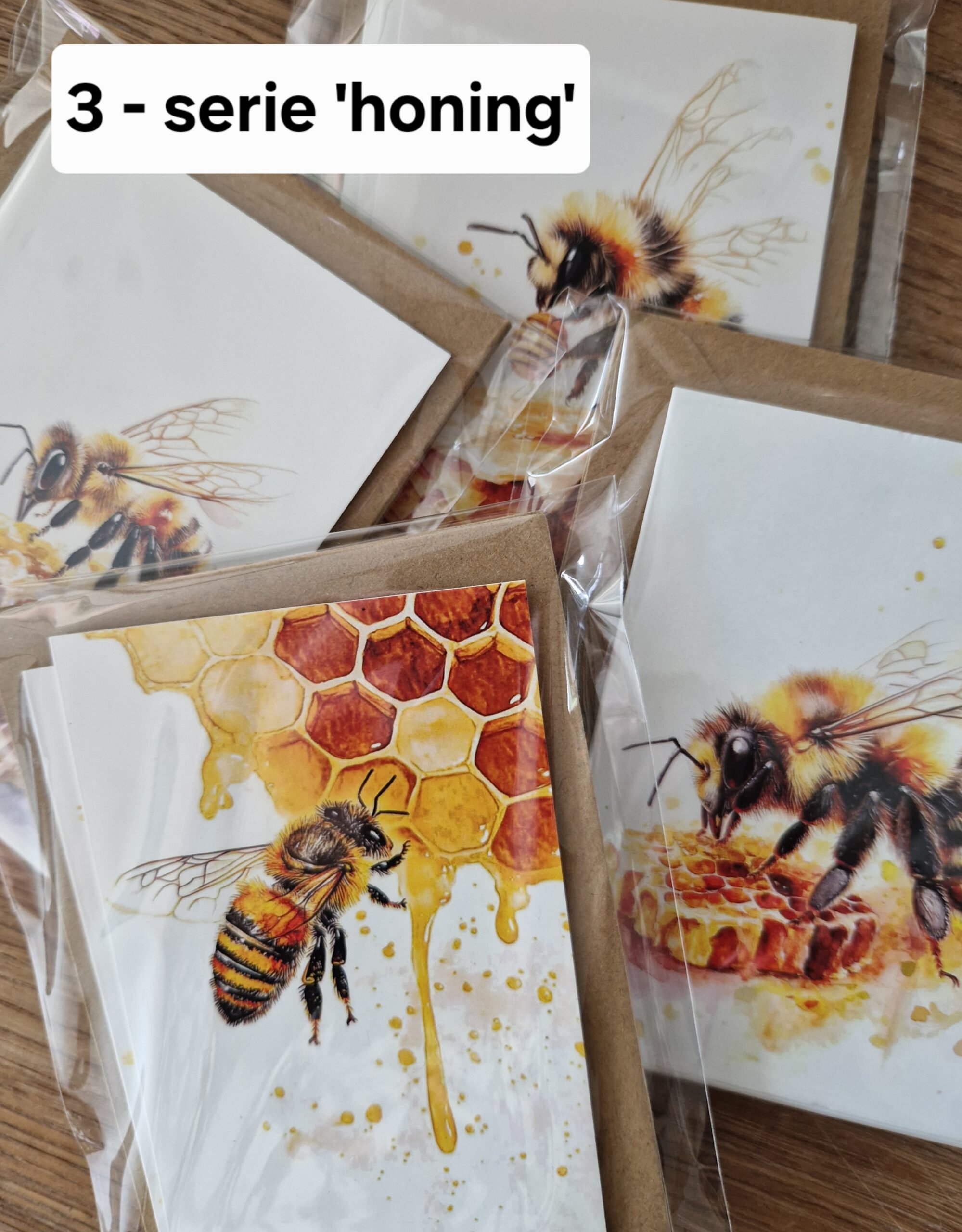 | ansichtkaarten | 1- serie van zes dubbele kaarten met roze bloemen en hommels, inclusief enveloppen, 2 – serie van vijf dubbele kaarten met 'cartoon'-bijen, inclusief enveloppen, 3 – serie 'honing', zes dubbele kaarten met bijen en honingraat, inclusief enveloppen, 4 – vrolijke dubbele kaarten met getekende bijen – vier verschillende, inclusief enveloppen, 5 – getekende kaarten met bloemen en bijen, serie van zes verschillende, inclusief enveloppen, 6 – serie van zes dubbele kaarten 'gele bloemen en bijen', inclusief enveloppen, 7 – vrolijke katten met bijen, zes dubbele kaarten met enveloppen, 8 – ansichtkaarten met eigen foto's uit onze eigen bijentuin, 5 kaarten inclusief enveloppen, 9 – serie 'vintage' ansichtkaarten, zes stuks, zonder enveloppen |
