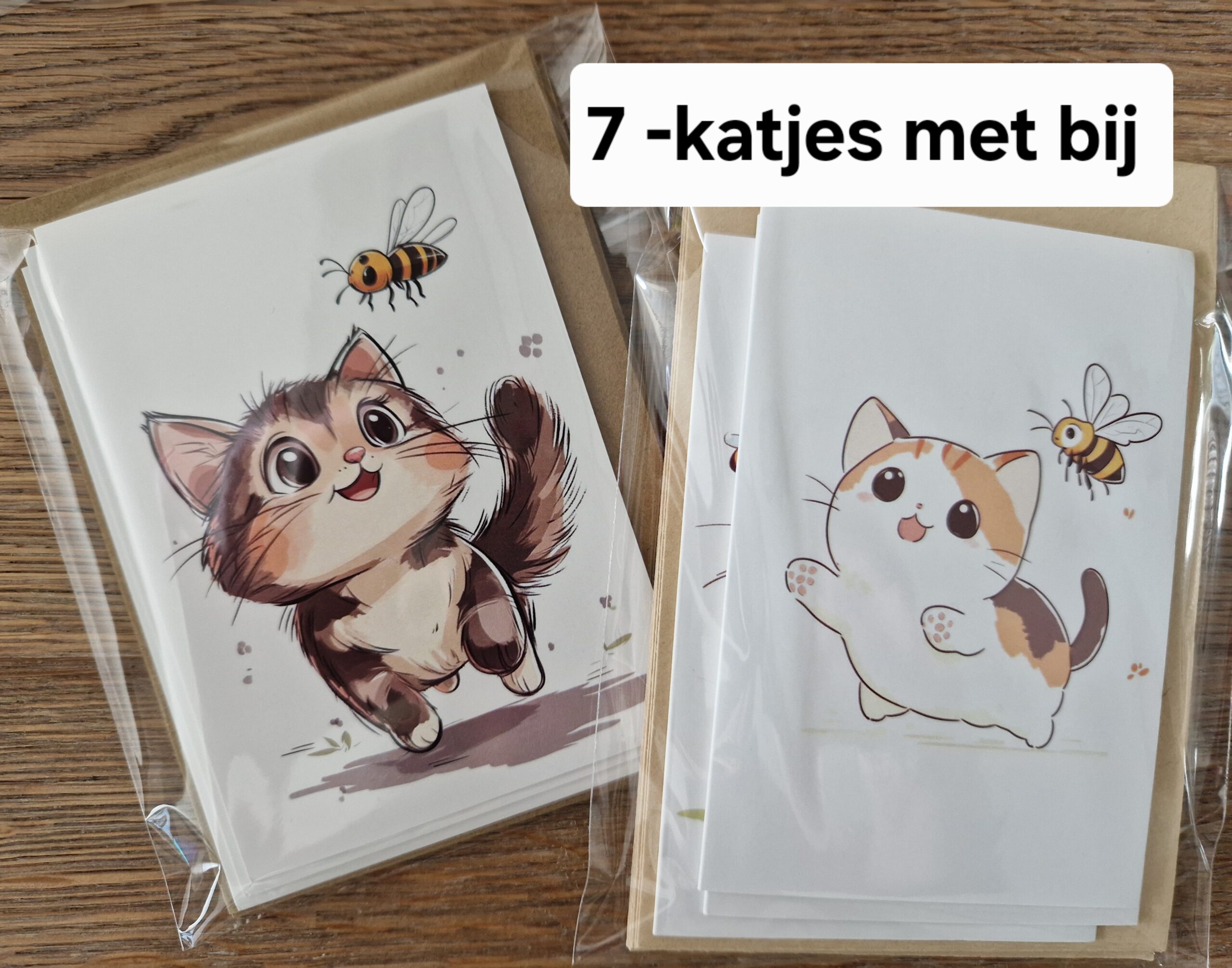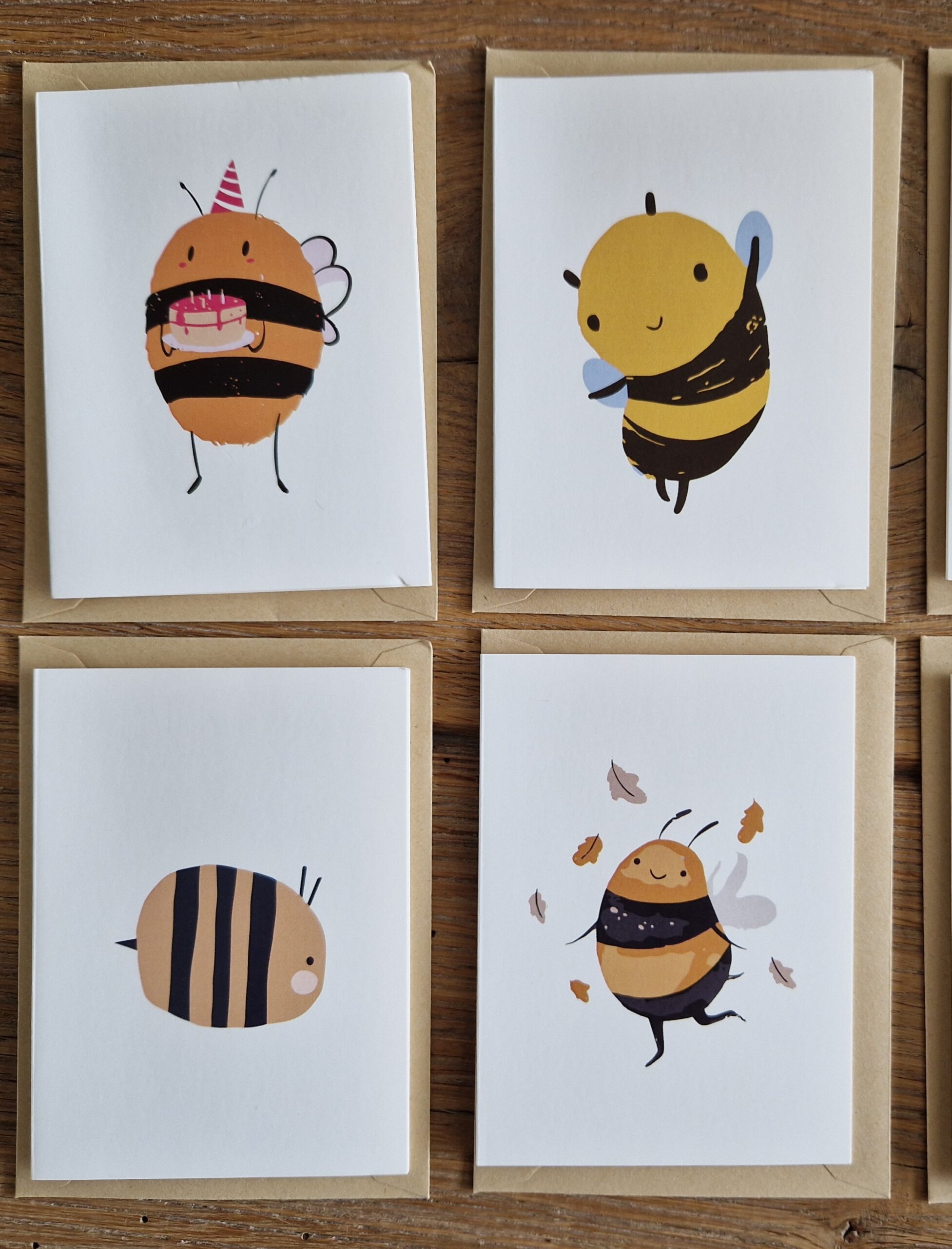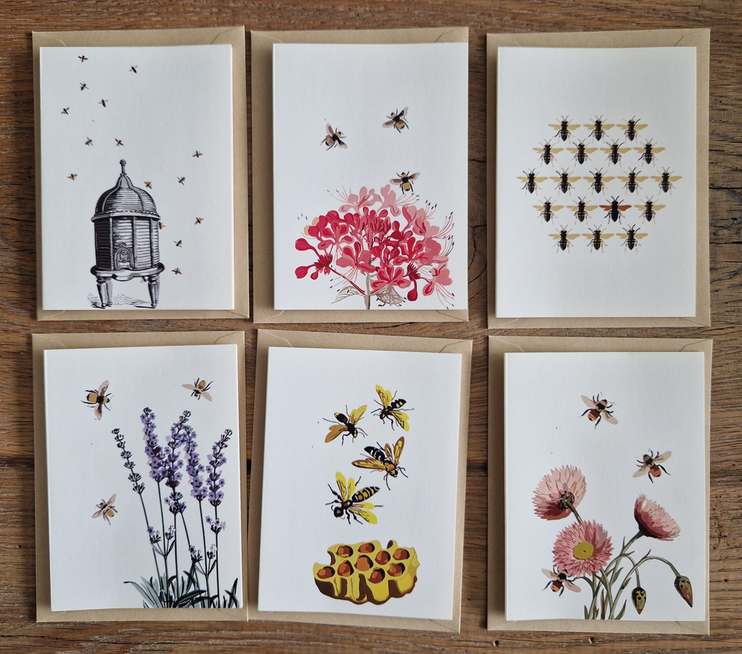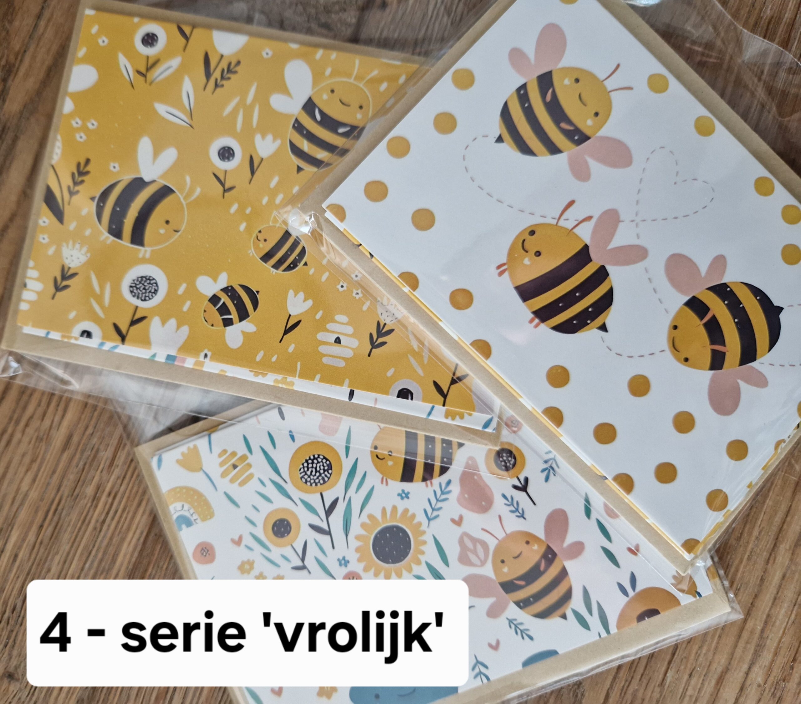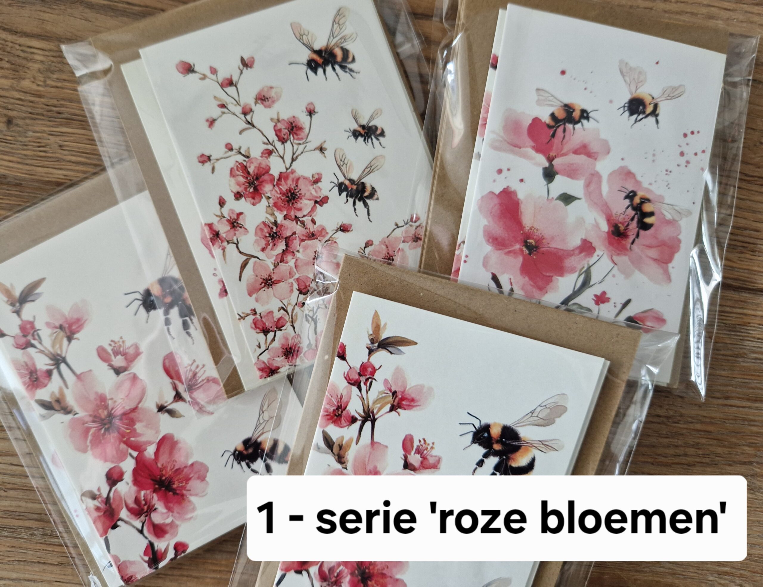 | ansichtkaarten | 1- serie van zes dubbele kaarten met roze bloemen en hommels, inclusief enveloppen, 2 – serie van vijf dubbele kaarten met 'cartoon'-bijen, inclusief enveloppen, 3 – serie 'honing', zes dubbele kaarten met bijen en honingraat, inclusief enveloppen, 4 – vrolijke dubbele kaarten met getekende bijen – vier verschillende, inclusief enveloppen, 5 – getekende kaarten met bloemen en bijen, serie van zes verschillende, inclusief enveloppen, 6 – serie van zes dubbele kaarten 'gele bloemen en bijen', inclusief enveloppen, 7 – vrolijke katten met bijen, zes dubbele kaarten met enveloppen, 8 – ansichtkaarten met eigen foto's uit onze eigen bijentuin, 5 kaarten inclusief enveloppen, 9 – serie 'vintage' ansichtkaarten, zes stuks, zonder enveloppen |