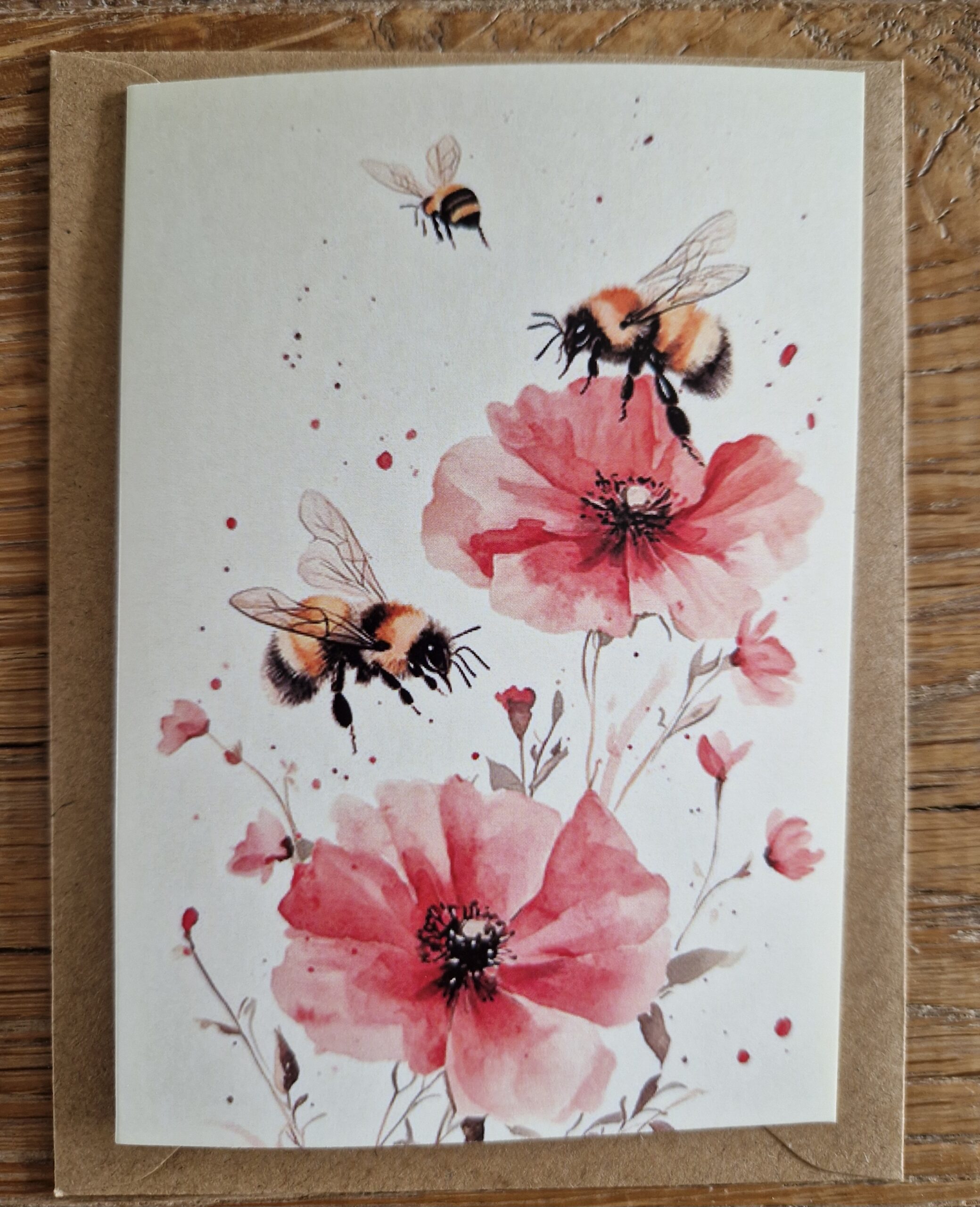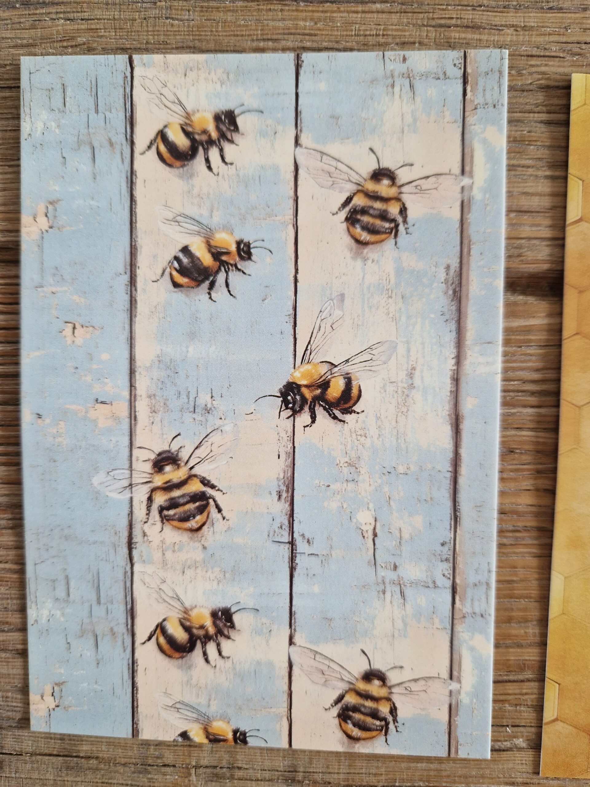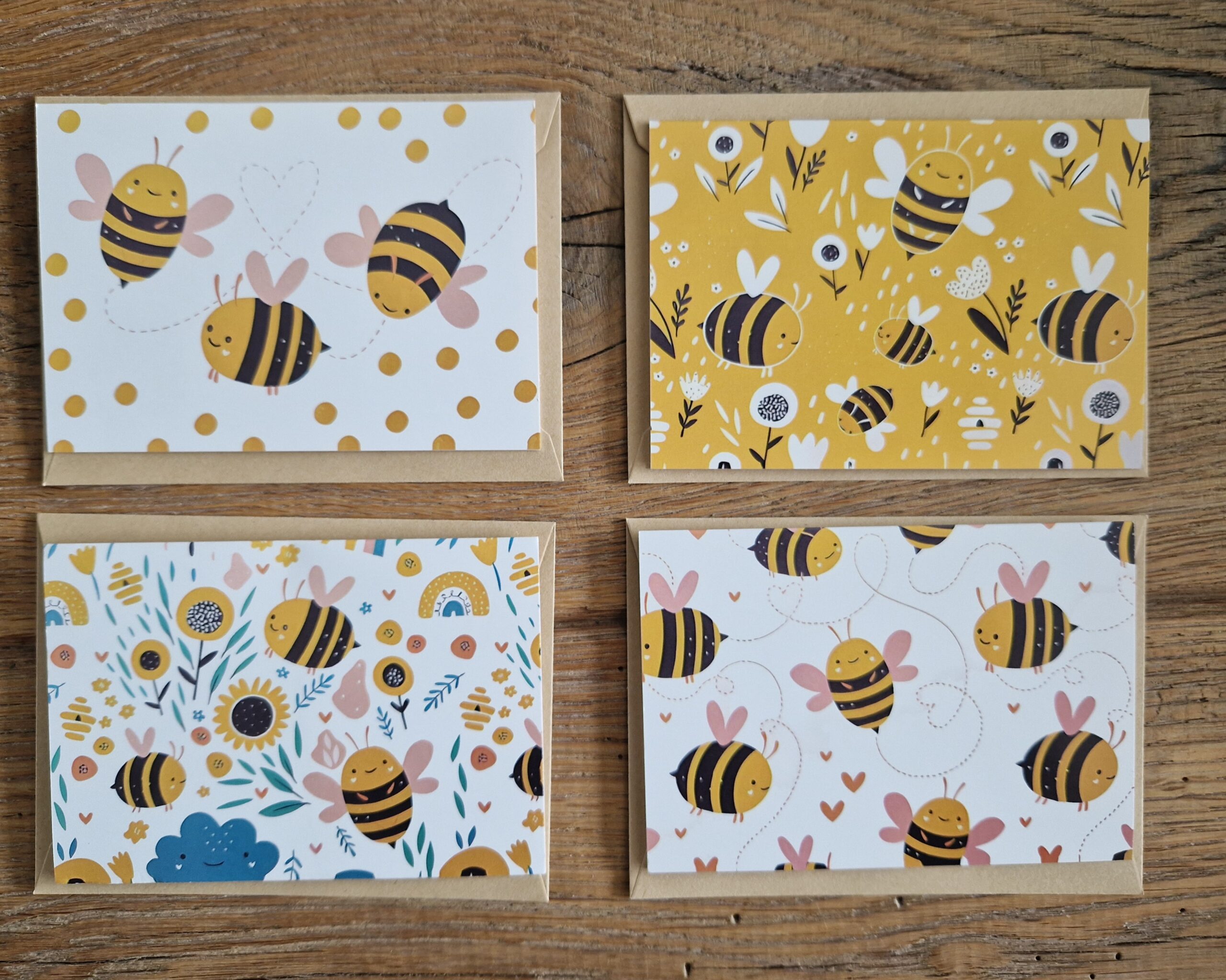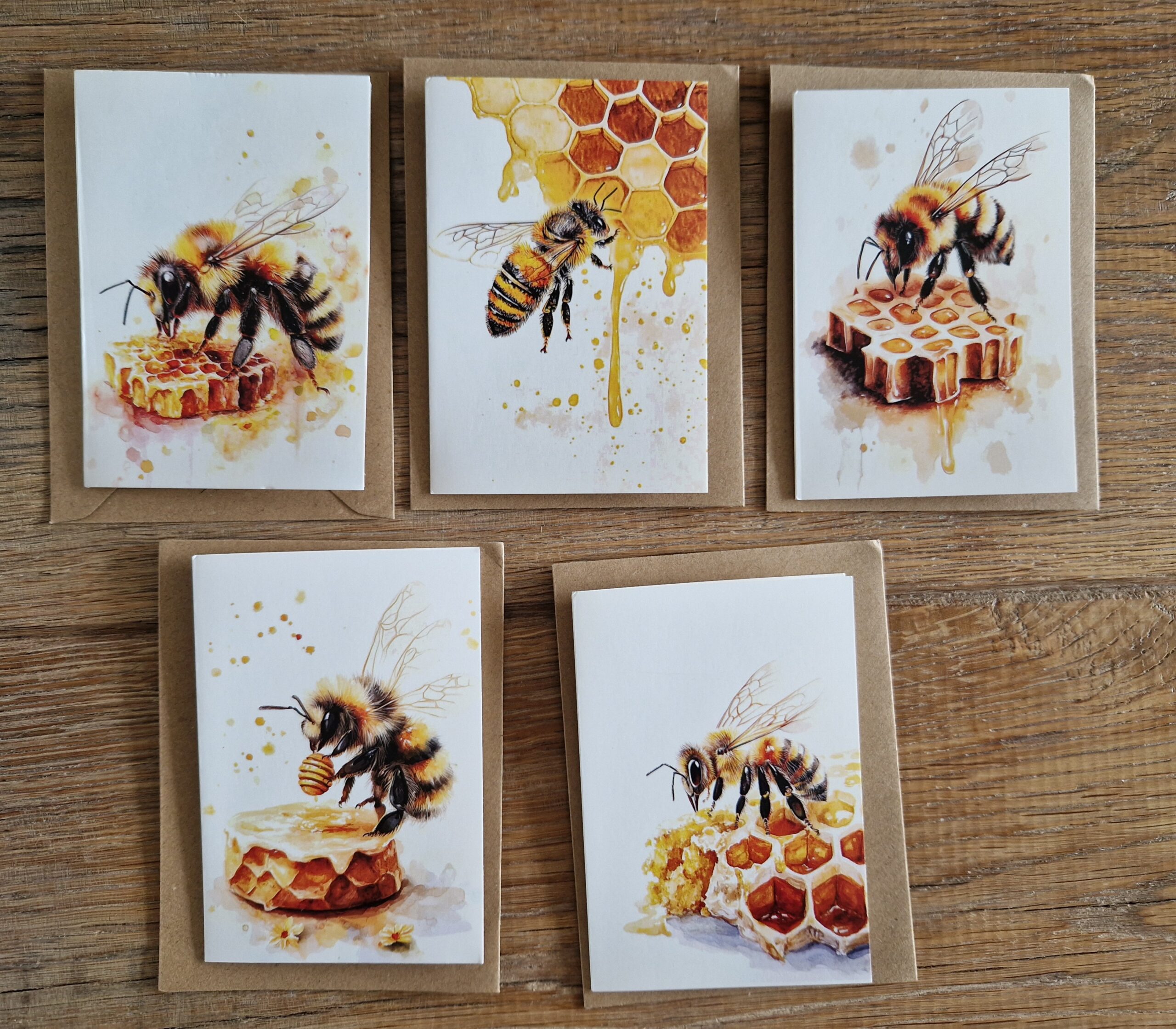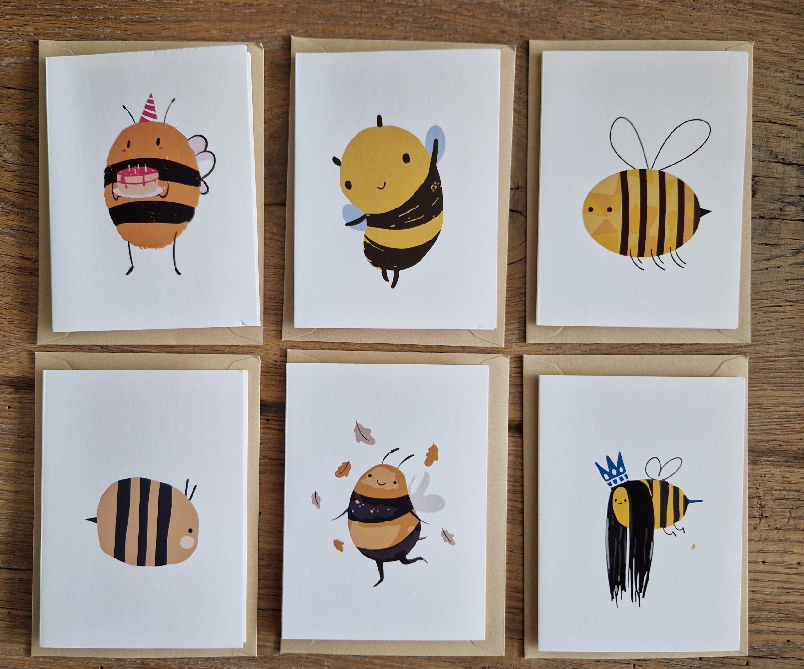 | ansichtkaarten | 1- serie van zes dubbele kaarten met roze bloemen en hommels, inclusief enveloppen, 2 – serie van vijf dubbele kaarten met 'cartoon'-bijen, inclusief enveloppen, 3 – serie 'honing', zes dubbele kaarten met bijen en honingraat, inclusief enveloppen, 4 – vrolijke dubbele kaarten met getekende bijen – vier verschillende, inclusief enveloppen, 5 – getekende kaarten met bloemen en bijen, serie van zes verschillende, inclusief enveloppen, 6 – serie van zes dubbele kaarten 'gele bloemen en bijen', inclusief enveloppen, 7 – vrolijke katten met bijen, zes dubbele kaarten met enveloppen, 8 – ansichtkaarten met eigen foto's uit onze eigen bijentuin, 5 kaarten inclusief enveloppen, 9 – serie 'vintage' ansichtkaarten, zes stuks, zonder enveloppen |